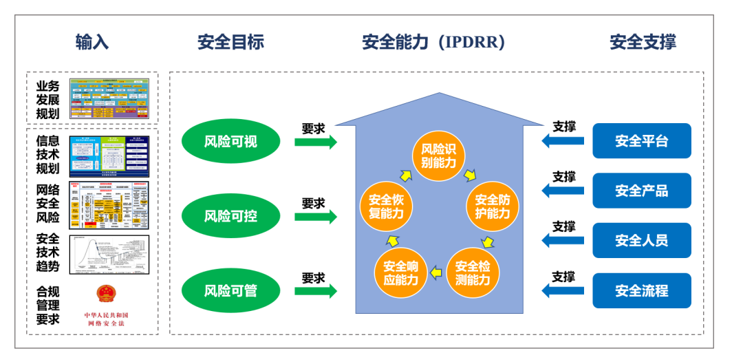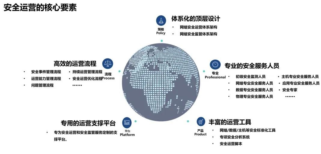 安全运营建设不能只靠安全产品、安全技术及某些名词的升级来实现,而是需要不断的随着网络现状、业务发展及攻击手段的发展而升级,动态实现安全运营建设目标,这里面最主要的还是人、流程、平台,工具等元素的有机组合。