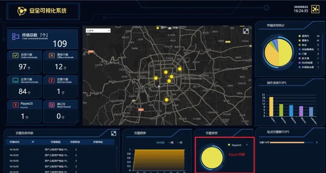 基于GIS方式展示出内网中所有受“Ripple20” 影响的物联网资产的全局显示,管理者具备全局评估抓手。