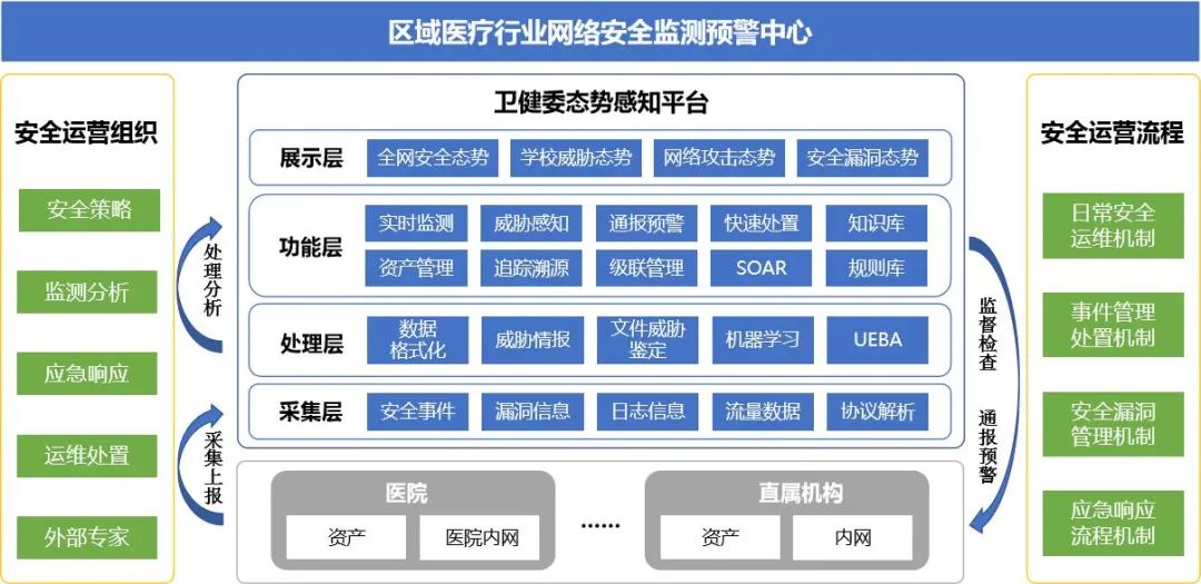 面向健康医疗行业的信息化场景,启明星辰关键信息基础设施智能化安全运营服务体系结合网络安全“三同步”原则,以安全风险和安全合规为驱动的服务理念,聚合“人员、流程、技术”进程,通过智能安全运营中心为各单位(各机构、各部门)输出专项基础安全服务、实战演练安全服务、持续性威胁管理与风险管控服务、应急响应及协同指挥服务和重大活动保障安全服务,有效支撑行业内各部门关键信息基础设施识别、防护、检测、分析、监测预警、追踪溯源、事件处置、安全恢复安全能力的建设,保护关键信息基础设施安全,面向场景需求,落实“三化六防“,立足三位一体共筑关基防控体系。