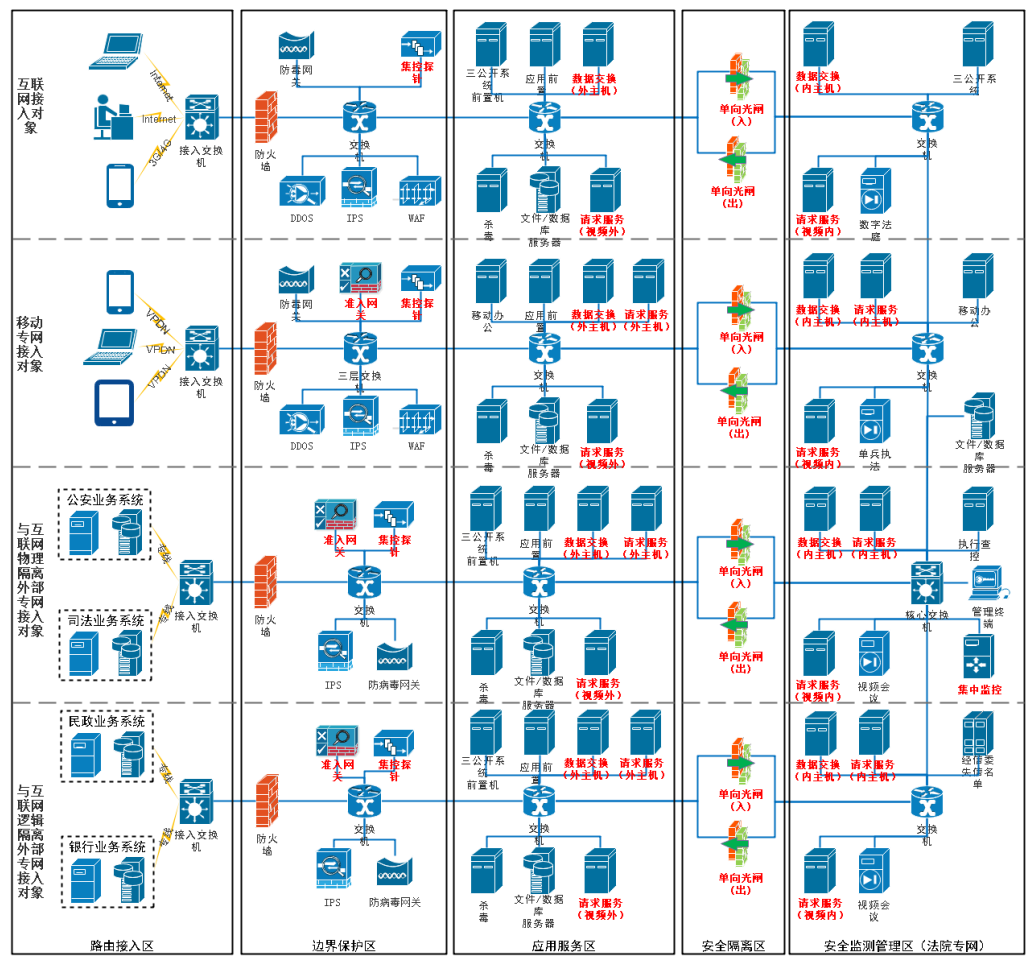 1、互联网接入对象:主要实现对互联网数据的采集和对外发布安全数据传输,如网站、文书发布系统、互联网庭审、案件查询系统等。