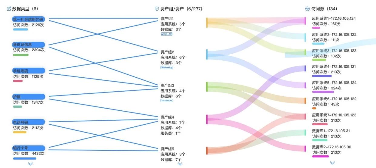 2、数据流转行为图谱:利用机器学习关联算法,形成不同场景的流转视图,继而清晰描绘出,不同敏感类型数据流经的应用、接口、数据库、表等链路节点的流转路径。