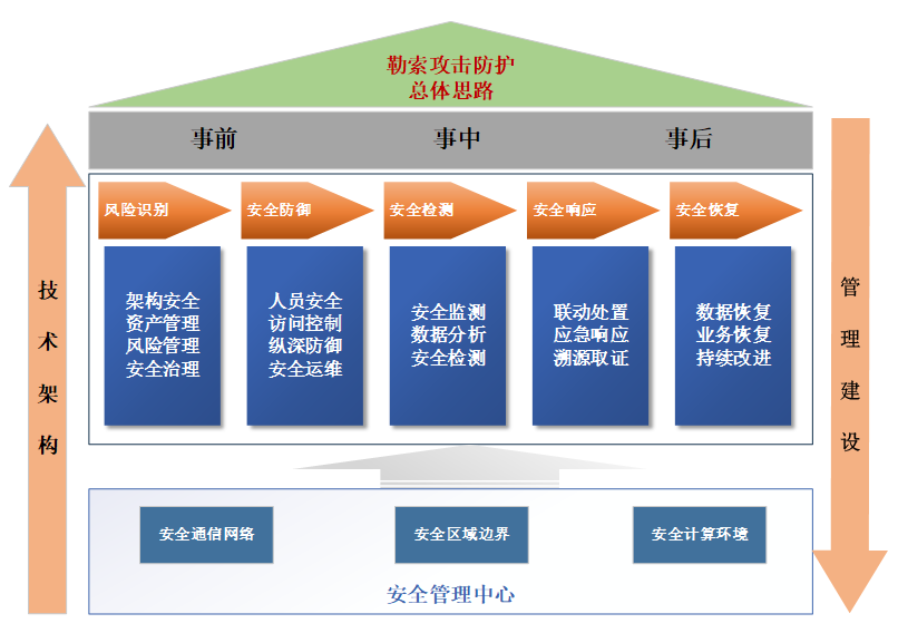 针对工业行业的勒索攻击防御,按照时间维度,启明星辰提出攻击事件发生前、中、后三个阶段进行防御: