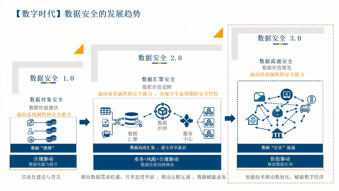 即数据流通安全。此阶段的数据开始流通,向企业外部流通,数据安全则需内嵌于数据流通、业务流程的每个环节,并明显以价值驱动。例如国家数据局的成立,“数据财政”等概念的提出,都是为加速数据流通,释放数据价值,提供组织和政策保障。