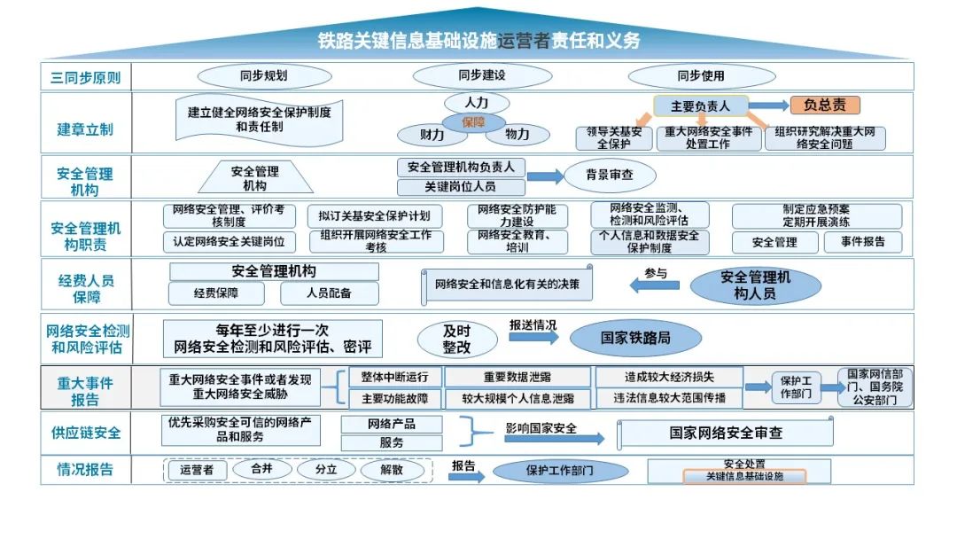 建立铁路关键信息基础设施全过程保护制度,要求安全保护措施应当与关键信息基础设施同步规划、同步建设、同步使用,明确规定了运营者在机构设置、人员配备、经费保障、产品和服务采购、数据保护、安全检测和风险评估以及数据保护、密码应用、保密管理等方面的责任和义务。