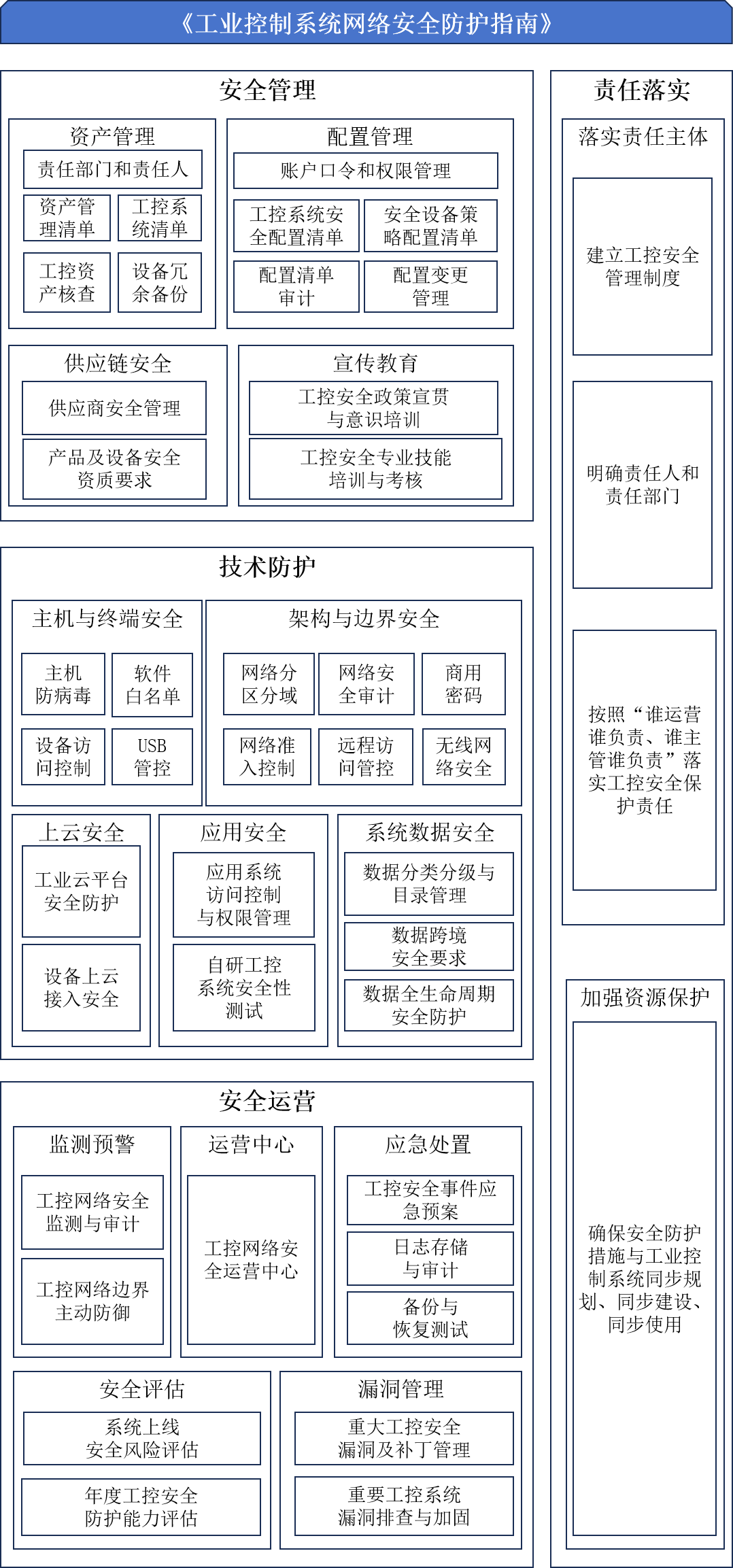 《指南》包含安全管理、技术防护、安全运营和责任落实四个方面,列出了33项具体防护指导。为方便大家学习参考,这里对《指南》进行了架构总结,如下图所示: