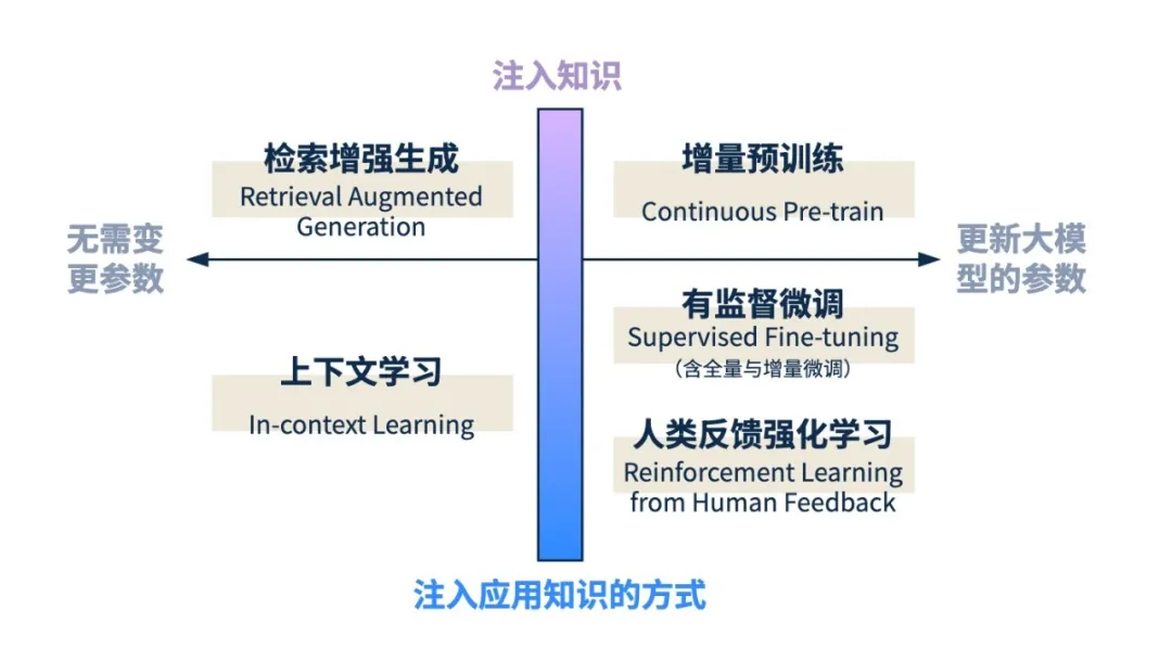 对于L1安全行业大模型,主要使用右半图的技术(增量预训练、有监督微调、人类反馈强化学习),通过更新模型参数,来获得一个具备更强安全知识的大模型;对于L2应用场景层,则会使用左半图的技术(检索增强生成、上下文学习),使大模型在实际场景中无需更新参数即可快速落地。