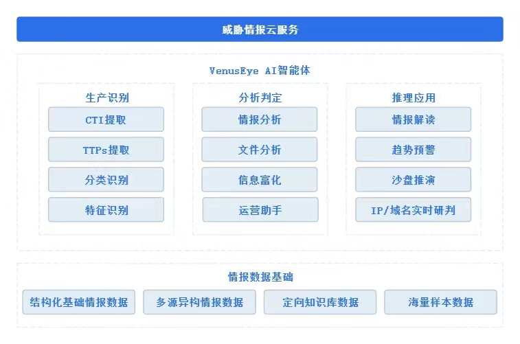 VenusEye威胁情报中心综合运用沙箱集群、同源性分析、知识图谱、人工智能等先进技术,生产和提供高质量的威胁情报信息。基于威胁情报生命周期的迭代进化,探索基于大小模型协同的AI+体系如何应用于增强威胁情报生产识别、分析判定和推理应用。