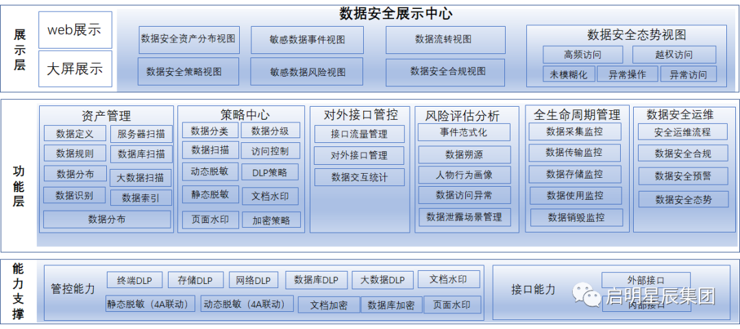 包括数据采集监控、数据传输监控、数据存储检查、数据使用监控、数据销毁检查等功能。对数据全生命周期的一个安全控制及监督检查。