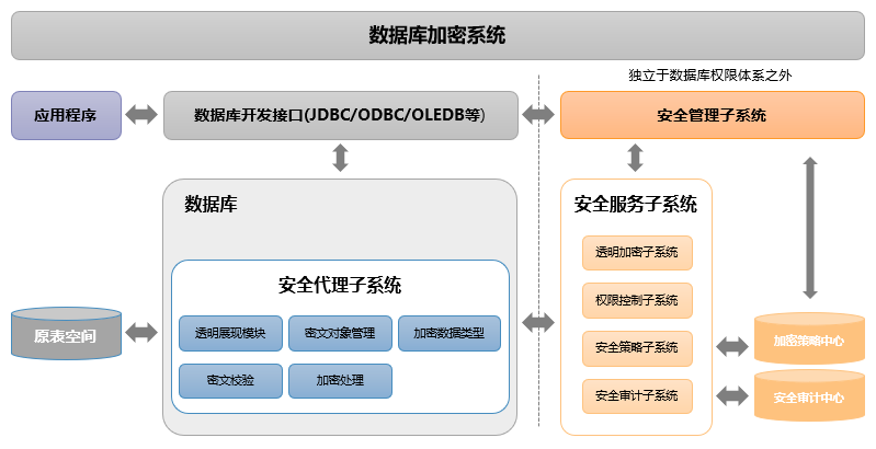 启明星辰数据库加密系统采用基于视图和触发器的后置代理技术,其核心思想是充分利用数据库自身提供的扩展机制来实现数据加密和对应用的完全透明。通过视图实现加密数据透明查询,通过触发器实现数据的加密插入、删除和更新处理。系统框架及功能如下: