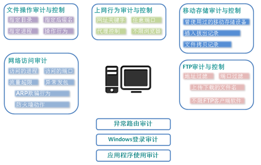 除此之外,可用内网安全风险管理与审计系统配合终端DLP实现准入控制、非法外联控制、主机监控审计、移动存储管理等,审计内容可以只限定为与内网合规管理相关的信息,保证在达到合规管理审计要求的前提下,充分保护终端用户个人隐私。通过“技术+管理”的手段共同抵御数据泄露风险,有效防护终端U盘、拷贝、打印等途径泄露数据。