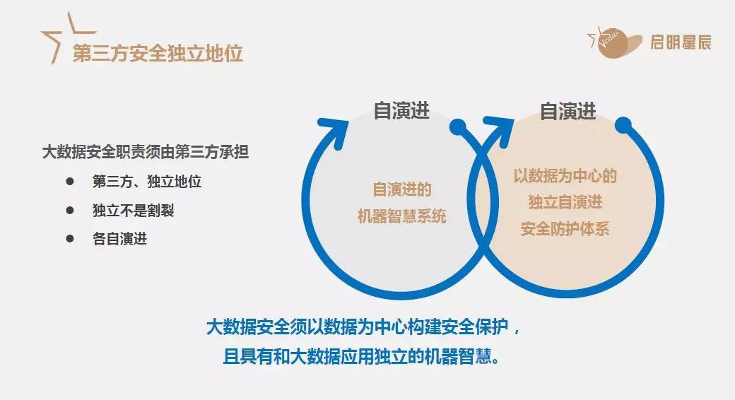 在大数据的时代构建安全,应该要赋予安全第三方独立地位,我们要建立的应该是一个自我能够演进,并且以数据为中心的相对独立的安全防护系统,而《网络安全法》及等保2.0则是自我演进的规则。