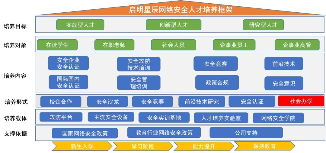 启明星辰网络空间安全学院经过多年经验积累与实践,结合国家及教育行业网络安全相关政策,通过网络安全学院、人才培养实验室等培养载体,借助校企合作、安全沙龙、安全实训等形式,从网络安全认证、安全攻防技术培训、安全竞赛等8个方面开展网络安全培训,能够为在校学生提供全方位的技术支撑和培训培养服务,快速提升网络安全人才的专业能力,积极为国家网络安全培养顶级的网络安全人才。