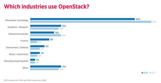 虽然IT行业仍然是报告中整体占比最大的行业类别,但OpenStack在金融行业的部署占比增幅最大,从2017年的3%飙升至2018年的8%。这其中代表用户就包括Banco Multiva,、eBay Classifieds Group、Progressive保险,、SBAB银行和大众汽车金融服务等大型金融机构。此外,政府/国防(从2017年的4%上升至2018年的6%)和零售/电子商务(从2017年的3%上升至2018年的4%) 行业的OpenStack部署量也有显着增长。