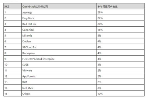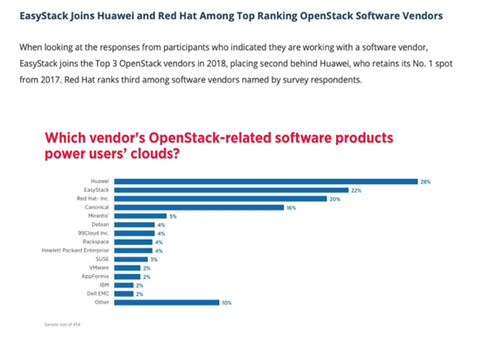 在参与调查的用户中,关于OpenStack软件供应商排名的报告显示为:“EasyStack(易捷行云)与华为和红帽一起成为本次用户调查报告的前三甲OpenStack软件供应商,排名第二;华为蝉联2017年和2018年两次全球用户调查第一名,红帽排名第三。”