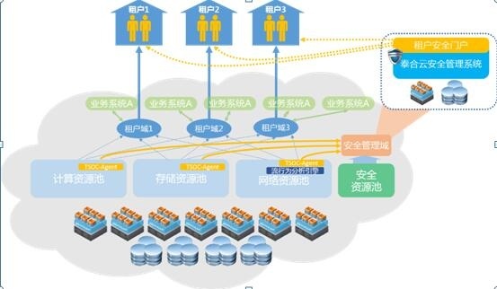 泰合云安全管理系统已软件的形式部署在云环境中,可以根据用户实际云环境的特点和要求,部署在云资源池所分配的虚拟化服务器主机之上,也可以部署在单独准备的实体服务器中。集中采集云环境中的各类安全事件、性能状态和流量信息,形成面向云资源池的集中安全监控和面向云租户的租户安全监控。部署示意图如下所示: